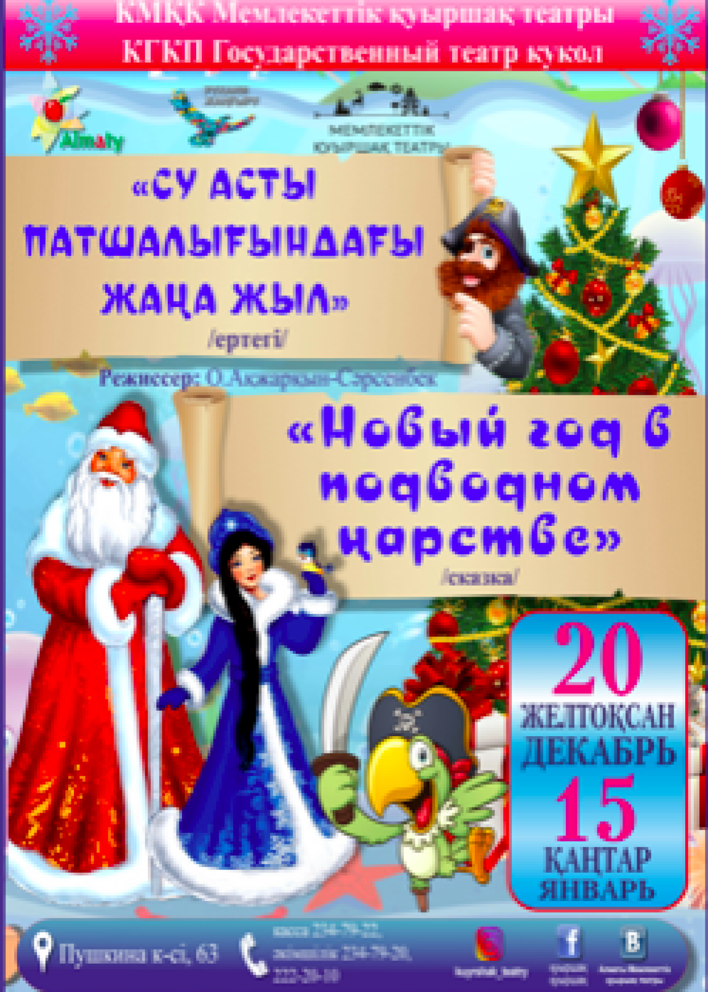 83 маусымын «Ана жүрегі» спектаклінің премьерасымен ашқан өнер ордасы жаңа жыл мерекесінің қарсаңында көрермен назарына кезекті «СУ АСТЫ ПАТШАЛЫҒЫНДАҒЫ ЖАҢА ЖЫЛ» (авт.: А.Сергеев, реж.: О.Ақжарқын-Сәрсенбек) ертегісінің премьерасын ұсынбақ. Көңілді әрі жарқын қойылым барысында кішкентай көрермендер акваханшайым Инфанта, Валун патша және оның уәзірі Скубамен бірге су астына саяхат жасап, жаңа жылды қарсы алу үшін әр түрлі шытарман оқиғалардан өтеді.